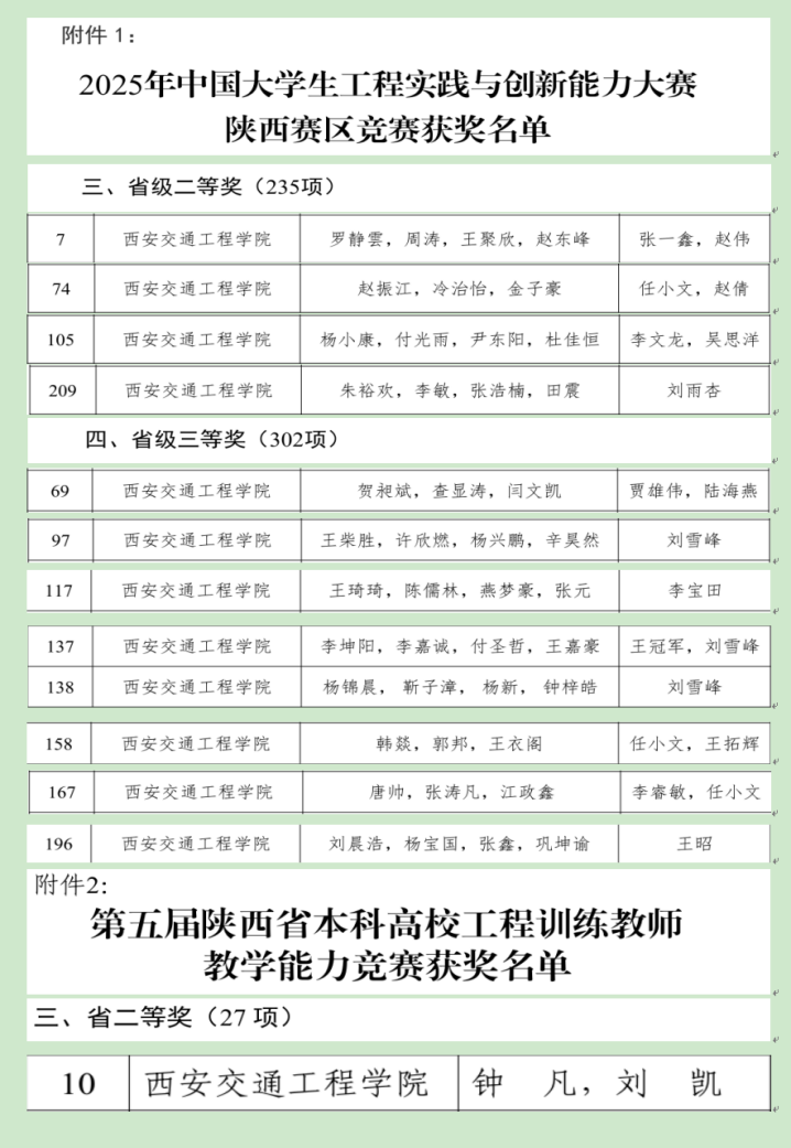 近日,从陕西省教育厅传来捷报:在 2025 年中国大学生工程实践与创新能力大赛陕西赛区比赛中,我校学子凭借扎实的专业功底、出色的实践能力与创新思维,一举斩获二等奖 4 项、三等奖8项;与此同时,在第五届陕西省本科高校工程训练教师教学能力竞赛中,我校教师以娴熟的教学技艺、先进的教学理念脱颖而出,荣获二等奖 1 项。师生双线发力、同获殊荣,充分彰显了学校在工程类专业人才培养与教师教学能力建设方面的显著成效。