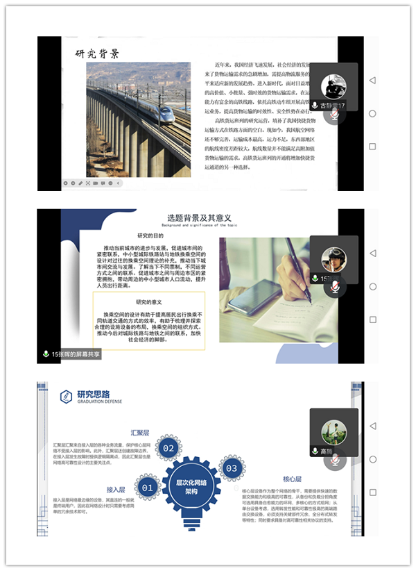 在答辩过程中,所有参加开题答辩的同学们都能从选题的背景、研究的目的和意义、研究的主要内容、拟采用的研究方法、研究进度计划、主要参考文献等方面向答辩组进行汇报。答辩组老师们在听取同学们的汇报后,能针对研究内容提出中肯的意见与建议,让学生们发现开题过程中的不足,为下一步毕业设计(论文)工作打好基础,理清研究思路。