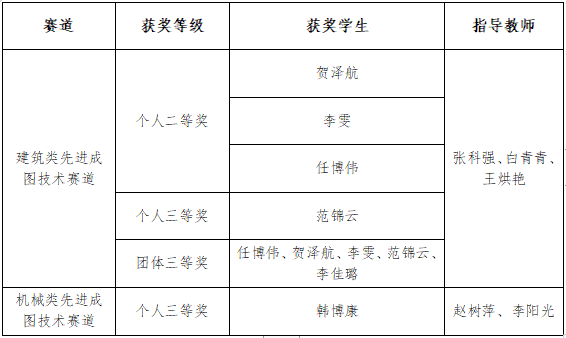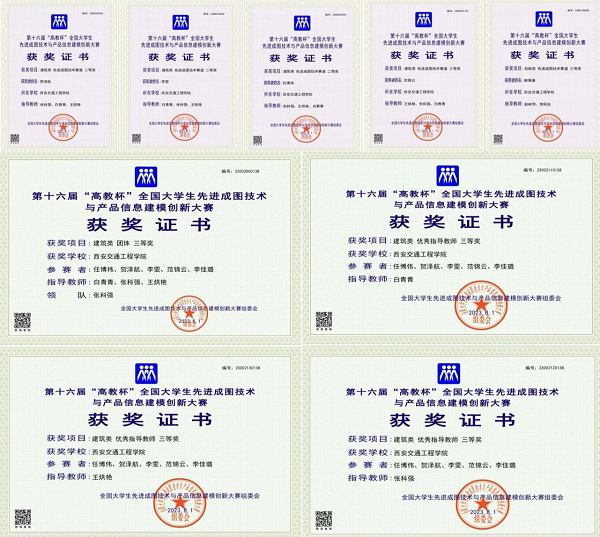 我校机械与电气工程学院8名同学和土木工程学院8名同学分别参加机械类先进成图技术赛道和建筑类先进成图技术赛道,经过激烈的角逐,我校获得建筑类团体三等奖1项,建筑类先进成图技术赛道个人二等奖3项,个人三等奖1项,优秀指导教师三等奖3项;机械类先进成图技术赛道个人三等奖1项。