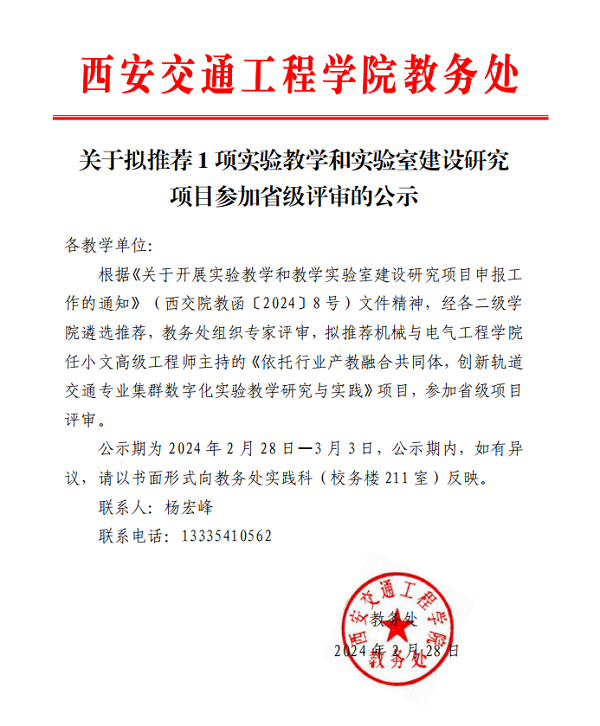 关于拟推荐1项实验教学项目和实验室建设研究项目参加省级评审的公示